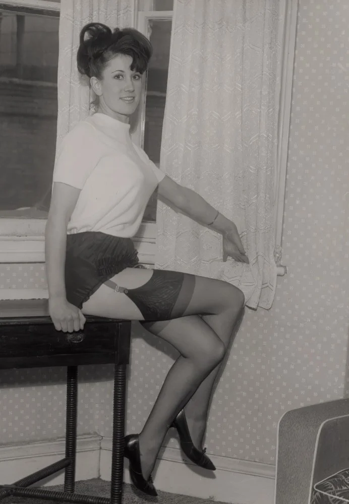 Julie Marsden is definitely a favourite of mine, and I enjoy posting her pictures. I love these two of her showing off her lovely, well-formed bottom, all encased in a lovely pair of silky, big knickers with black stockings to complement it perfectly. Delighful!