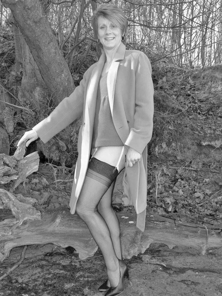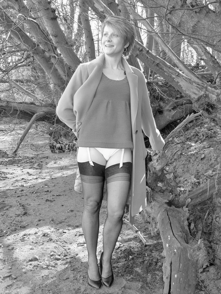 Out for a walk with Wendy in the countryside, who appears to have forgotten to put on her skirt, so it’s a good job she has that long coat on. I occasionally wonder how many girls I’ve walked by with very little on under a long coat.